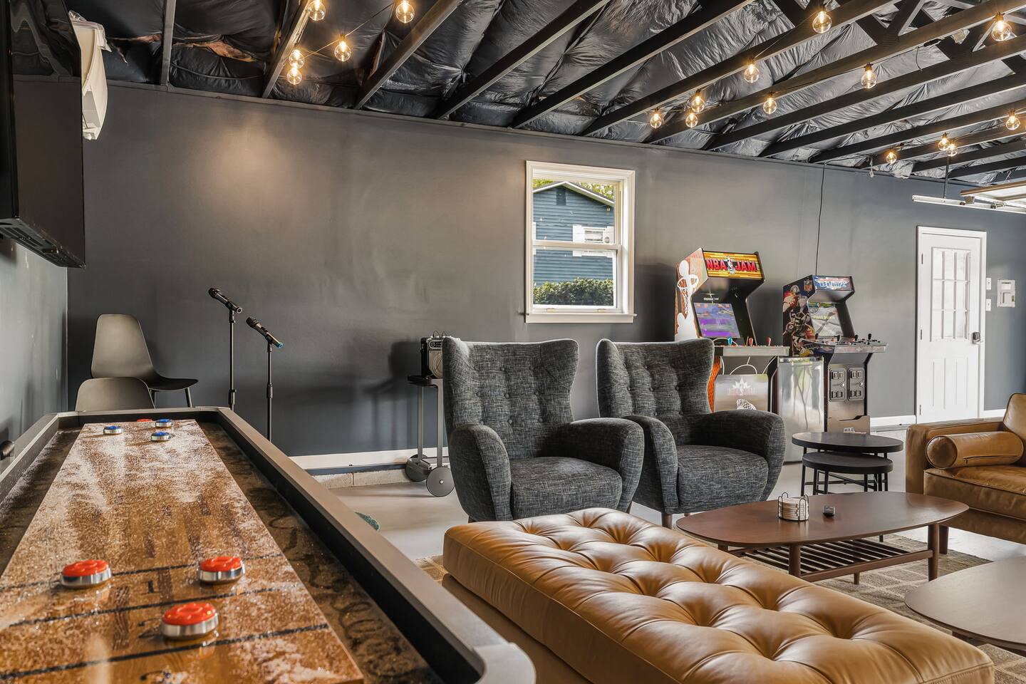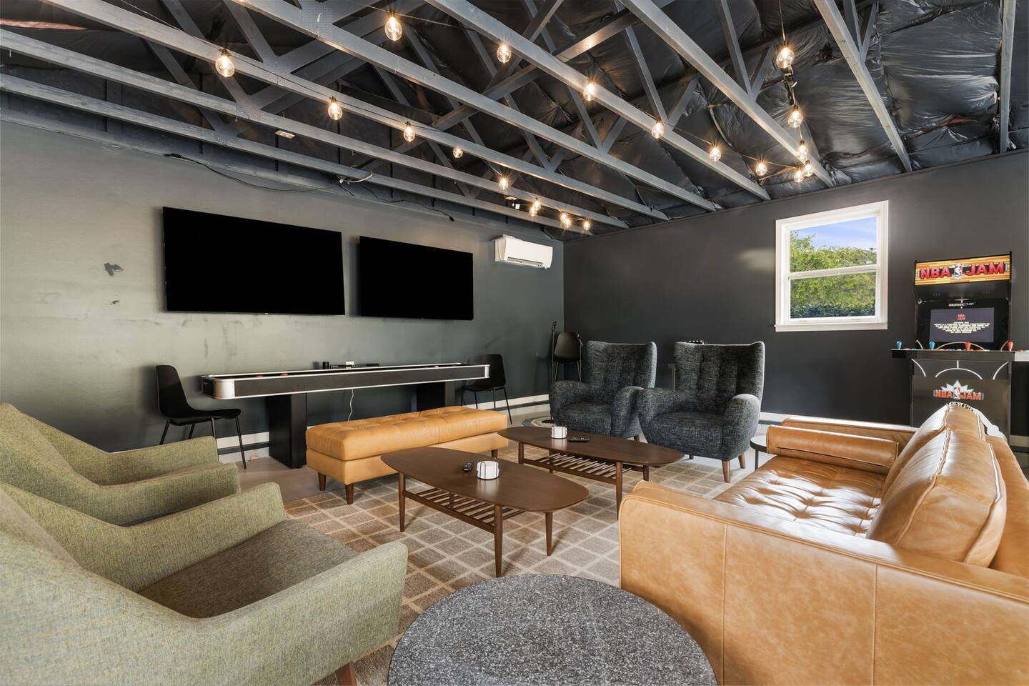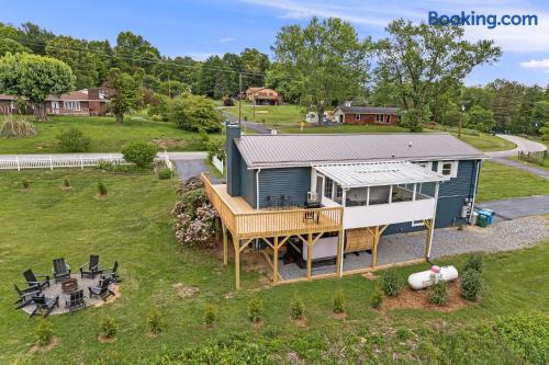 Pet Friendly: Bring up to 2 pets for a flat $400. Indoor Amenities: *High Speed WiFi throughout *2 Fully Stocked Kitchens *Game Room with karaoke, shuffleboard, arcade games, and so much more *Sunroom *Crib, High-Chair and baby toys *Multiple Workspaces *Smart TV's Game Room Amenities: * Ping pong table * Karaoke with two mics * Shuffleboard table * Poker table with set * NFL blitz arcade * NBA Jam arcade * Two 60 inchTVs * High top seating * Mini fridge Outdoor Amenities: *Hot Tub - 6 Person *Barrell Sauna - 6 Person *Fire pit and outdoor games *Parking for up to 8 vehicles *Large Deck w/ grill Location: This house is located just 15 minutes from downtown Asheville and moments away from some of the top breweries, wineries and eateries in North Carolina. The Layout: First Level: This open concept layout hosts the living room, dining room, and kitchen. It has an inviting atmosphere with a large couch, 2 accent chairs, a dining table for 8, and kitchen table for 4. In the kitchen you'll find all of your essentials along with all new appliances. Steps off the kitchen you'll find the amazing sunroom with seating and another TV. 6 Unique Bedrooms: On the main floor, you'll find 3 bedrooms. Bedroom 1 has a queen bed while bedrooms 2 and 3 each have their own king bed. Head downstairs to bedrooms 4, 5, and 6. Bedroom 4 has a queen, bedroom 5 has 2 fulls, and bedroom 6 has a king bed. Also has a pullout couch that can accommodate 2 person. Lower Level: In addition to the downstairs bedrooms, you'll find a second kitchen, making that morning coffee run that much more convenient. Other things to note: Check-in is at 4 pm Check-out is at 10 am Please do not go across the creek in the backyard.
